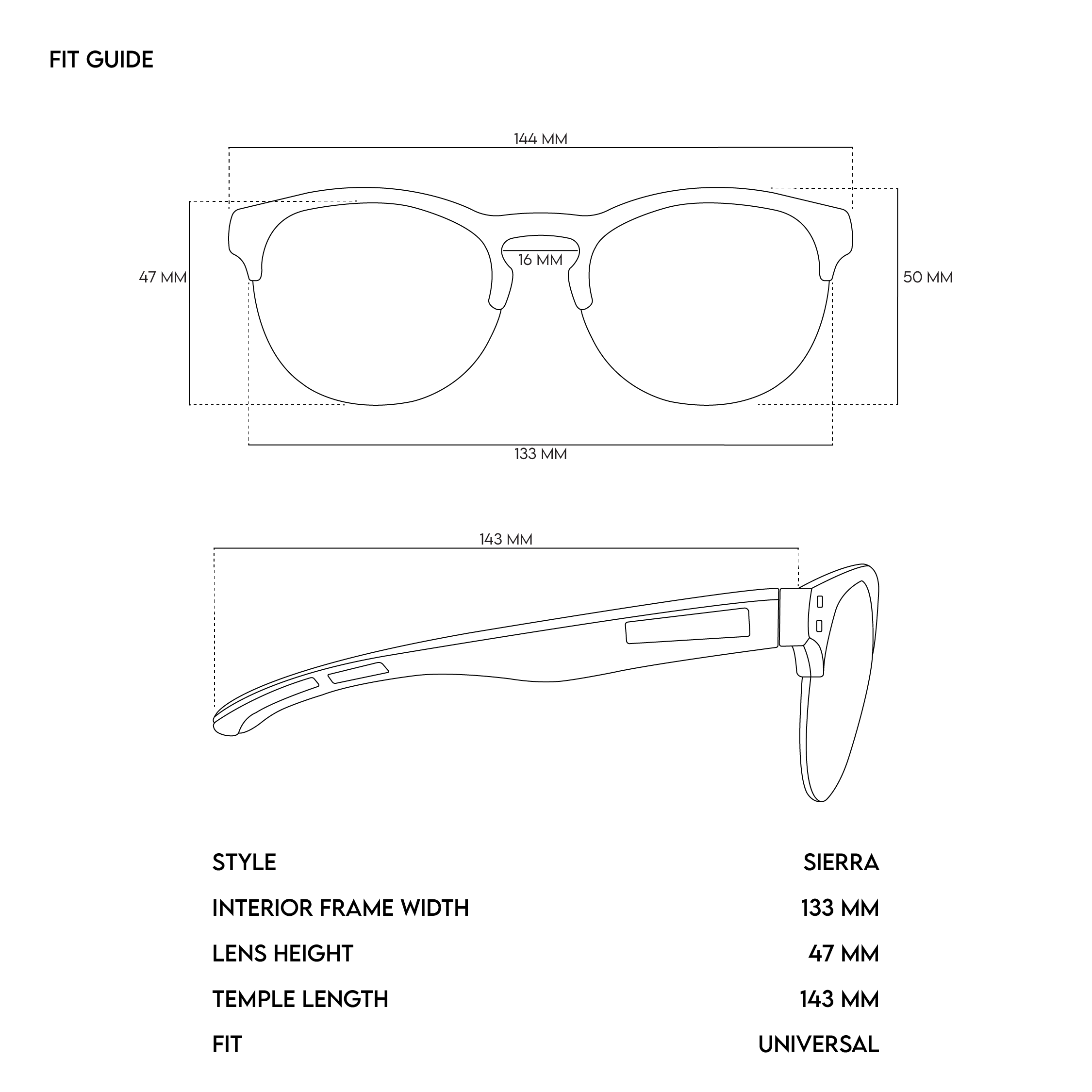 Dimensions(mm): Temple Width-143, Arm Length-140, Lens Height-47