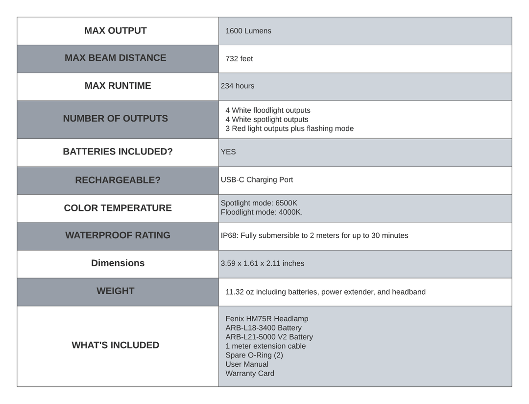 Designed to withstand the toughest conditions, the HM75R’s full metal body is both impact and corrosion-resistant. The extender cable securely locks into the headlamp, ensuring a reliable connection. Rated IP68 for waterproofing and tested for 2-meter drops, this headlamp is ready for any challenge. Additionally, the flashing red output enhances visibility and safety. The package includes 2 batteries - the ARB-L18-3400 battery goes into the headlamp and the ARB-L21-5000v2 battery goes into the included power bank. Whether for professional use, outdoor adventures, or emergencies, the HM75R headlamp is your dependable companion, lighting the way forward.